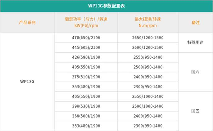 从上表参数中能够看到,WP13G发动机的功率范围实现了从480马力到650马力全覆盖,最大扭矩达2650N·m,国六最大扭矩转速延伸至950r\/min。