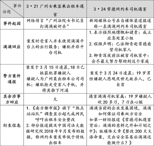 在微博渠道上,截至3月27日12时,“3·21广州女乘客乘出租车遇害”事件的微博话题热度最高的为@时间视频发起的#法院女书记员深夜打车遇害#,阅读量约213.4万次,讨论1117条,而“3·24常德网约车司机遇害”事件的微博话题热度最高的为@新浪新闻发起的#滴滴司机遇害案涉事学生自首#,阅读量约1.5亿次,讨论9312条。