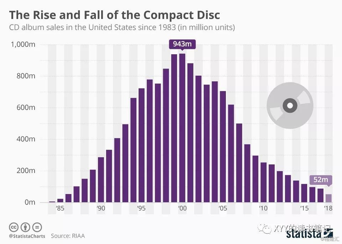MTV得其时,商业模式开始逐步走上正轨。MTV成立于80年代初期,也是唱片公司发展的一个相对低点,其急需一个新的催化剂使得整个音乐行业重燃。而之所以说,MTV得其时也在于说,也就是从80年代开始,音乐行业开始了长达15年的CD黄金时代,CD的销量从83年开始腾飞,到2000年达到9.4亿张,行业规模达到数百亿美金。迅速崛起的销量必然带来井喷的营销需求,MTV在内容源方向享受了很大的行业发展红利。