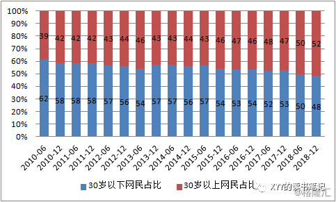 然而,随着时间的推移,人总有变老的一天,一个事实就是中国互联网网民30岁以下网民占比在2018年6月已经低于50%,这其中一方面是互联网在逐步渗透中老年人群,另一方面就是第一批核心网民已经来到了30岁以上了,毫无疑问,随着时间推移,这个占比还会进一步降低。
