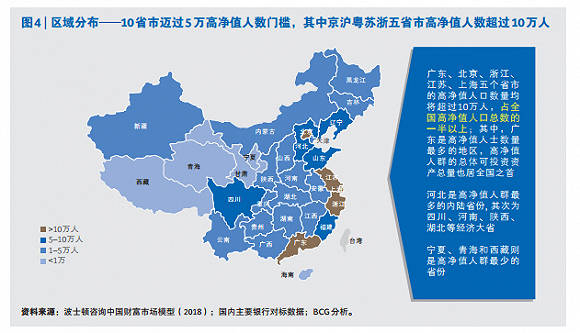 在区域分布上,高净值人群集中在北上广和江浙。报告指出,随着国民经济的持续增长,截至2018年底,已有10个省市迈过了高净值人数5万名的门槛。