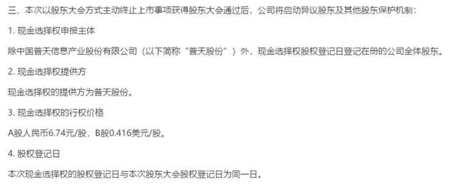 *ST上普推出了现金选择权。对于不愿意主动退市的投资者,由*ST上普的控股股东普天股份提供现金选择权。现金选择权的行权价格为A股人民币6.74元/股,B股0.416美元/股。为此,普天股份需为*ST上普不超过65,352,079股A股股份和124,800,000股B股股份提供现金选择权,总计花费约7.88亿元。