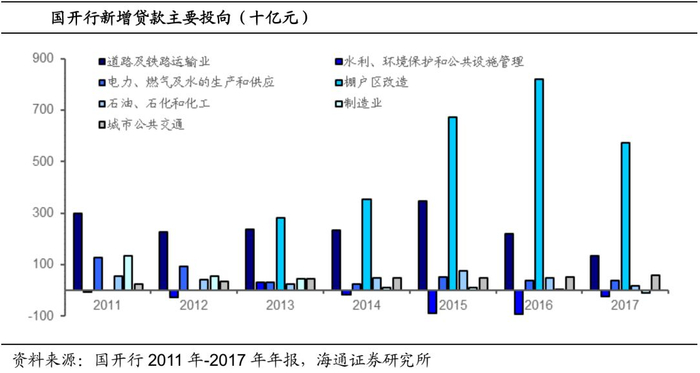 从职能上看,国开行一直围绕服务国家经济重大发展战略,业务类型涉及基建与棚改等,与地方政府隐性债务有较多重叠。从国开行历年新增贷款额来看,其贷款主要投向领域均具有一定的政策导向,其贷款去向多为基建、制造业等,2013年后主要为棚改。