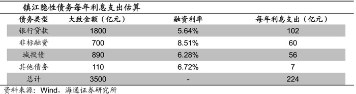隐性债务融资利率方面,对于城投债的利率,以全部镇江市城投债余额加权的发行票面利率为参考指标,约为6.28%;对于银行贷款利率,以5年以上中长期基准利率上浮15%的5.64%来算;对于非标利率,根据用益信托网数据,在2018年1月至今发行并投向基础产业的信托产品平均收益率为8.51%。其他债务的利率用以上债务的平均值来计算,大约6.72%。