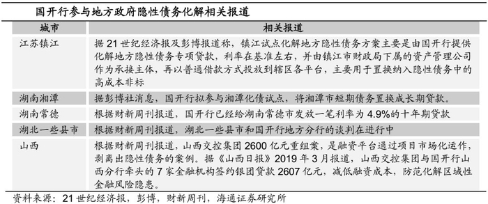 此外近期关于国开行参与隐性债务化解的报道,主要集中于一些债务率较高省份的地市、区县级城市,如江苏镇江、湖南湘潭、湖南常德、湖北一些县市。报道中国开行参与隐性债务化解的方式基本为发放贷款借新还旧,或者以长期贷款置换短期贷款。
