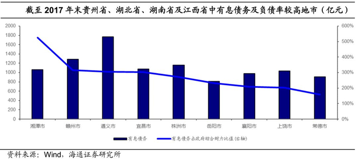 以贵州省、湖北省、湖南省及江西省为例,我们主要关注非省会的地市级债务情况,其中湘潭市、常德市、遵义市、宜昌市、襄阳市、株洲市、岳阳市、赣州市及上饶市综合有息债务总量及其占政府综合财力的比值,均处于较高的水平,建议重点关注。