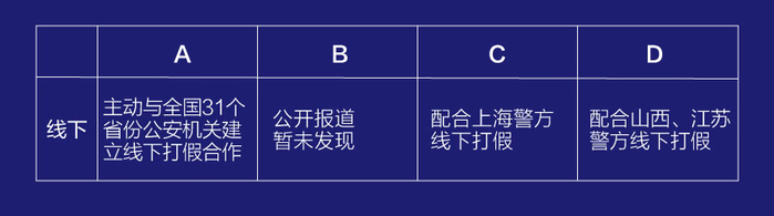 通过搜索公开报道,平台B未在线下源头打击上投入太多精力;平台C曾联合上海等地警方开展线下打假,平台D曾协助山西、江苏等地警方开展线下打假。