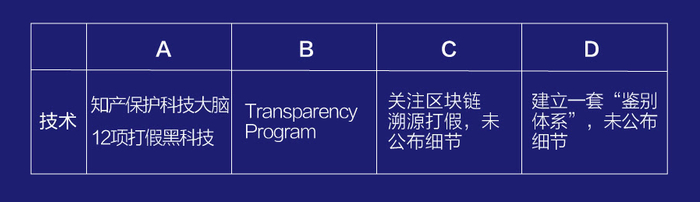 平台A打假核心技术为“知产保护科技大脑”。据公开报道,平台A的知产科技大脑拥有上亿个商品特征、百余个算法模型、微表情识别、异常营销动作预警,已覆盖开店、商品发布、营销活动、消费者及权利人评价等各个商业环节,成为以平台A数字经济治理体系的核心竞争力。