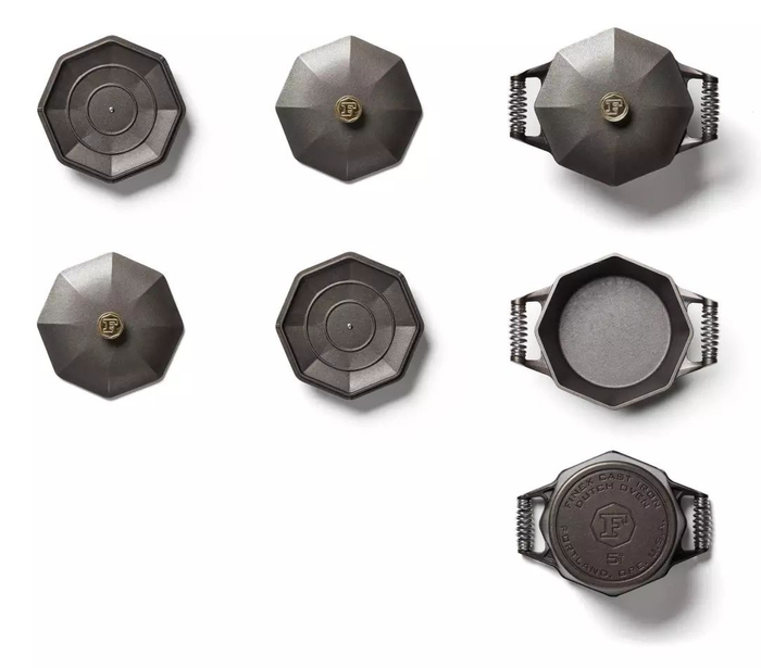 总部位于美国波特兰的 FINEX 采用一种非常独特的设计,所以一下子就从其他同类产品中跳脱出来。设计有一种户外风味,全黑色的锅身配以螺旋状把手,据说隔热更好,握感也更好。八边形的锅身,更容易脱模和盛舀食物。美国制造,24cm的双把手带盖铸铁锅售价300美元。