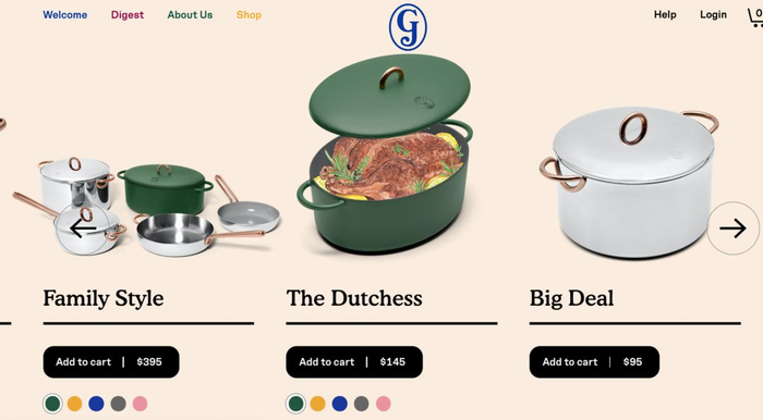 官网里的“内容”多过“产品”,很多图文并茂的食谱供人免费取用。产品本身也提供了许多非传统的色彩选择,哑光磨砂质感的克莱因蓝、荧光粉和绿色等等。