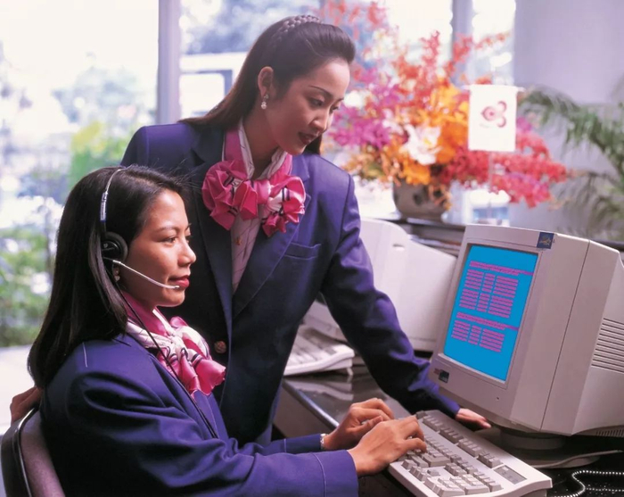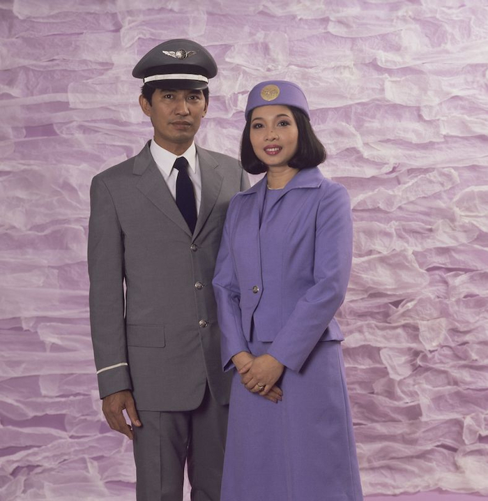 九十年代,泰航的制服是白底兰花图案的衬衣搭配紫色的半身裙,另外还配有紫色西装外套。玫红色的真丝围巾使整体搭配端庄而出挑。