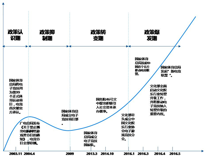 2016年4月国家发改委、教育部、工信部等24个部门联合下发《关于印发促进消费带动转型升级行动方案的通知》,明确提出要“开展电子竞技游戏游艺赛事活动”,电竞产业迎来了极大地转机。