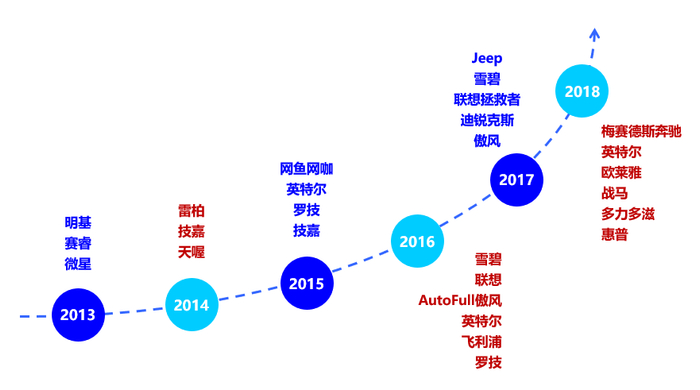 职业化水平的提升也在不断推高电竞赛事的商业化价值,出现多品类赞助商。在电竞产业发展初期,赞助商以游戏外设、直播平台、游戏衍生等相关垂直行业为主。而随着近年来受众覆盖大幅拓宽,传统厂商注意到了电竞赛事价值的洼地,赞助商层级和赞助量级不断增加,食品饮料、快消、汽车、电子等诸多传统行业纷纷入局。