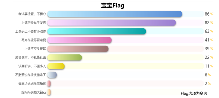 反观孩子们的flag,86%的宝宝Flag都与学业相关,包括“考试要检查,不粗心”、“上课积极举手发言”等。不难发现,父母的过度担忧可能是不需要的,孩子们具有自我控制意识。除了学业相关的内容,孩子们的答案也显示出了 “乖宝”属性,这些“小棉袄”们能体会到家长的辛苦,“想要给妈妈揉肩捶背”,“想要给妈妈买颗大钻石”。