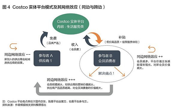 其次,需要提醒的是,做平台模式一定要有网络效应,没有网络效应的平台,就像传统的商业模式一样,是没有威力的。Costco平台是一个双边平台,参与者是供应商(包括Costco本身也是参与者)与会员消费者。该平台的网络效应主要体现如下: