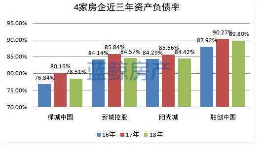 蓝鲸房产梳理TOP20房企的资产负债率数据发现,绿城中国(HK:03900)、新城控股(SH:601155)、阳光城(SZ:000671)等4家房企的资产负债率明显下降。其中,降幅最高的是绿城中国,2018年资产负债率为78.51%,相比2017年的80.16%,下降了1.6个百分点。