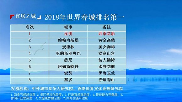 在全球城市中,气温、森林覆盖率、负氧离子含量、空气质量、蓝天可见天数等数据上极为突出,昆明位居亚洲避暑城市第一,在2018年国际花园城市比赛中荣获金奖。