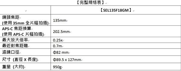 索尼粉看过来!Sony Taiwan今(11)日上市E接环全片幅镜头FE 135mm F1.8 G Master(型号:SEL135F18GM),为Alpha E接环阵容中第31款全片幅镜头,亦将使现有镜头总数增加至49颗。