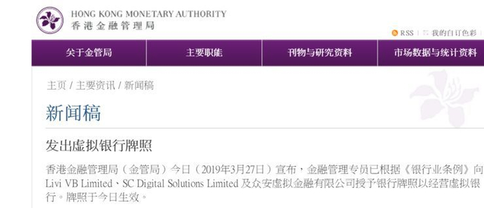 2019年3月27日,香港金融管理局宣布,向三家公司颁发虚拟银行牌照。