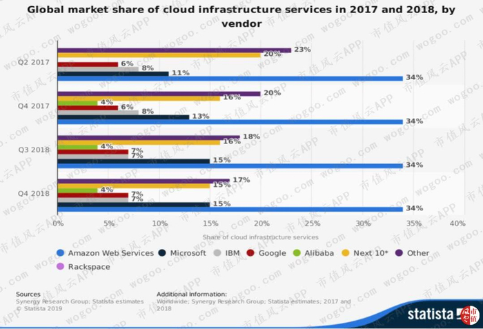 目前,亚马逊AWS(截至2018年市场份额:34%)和微软Azure(15%)两家公司已经吃下云市场的半壁江山,剩余的一半市场也由IBM(7%)、谷歌(7%)和阿里(4%)这些强有力的竞争对手在争食。