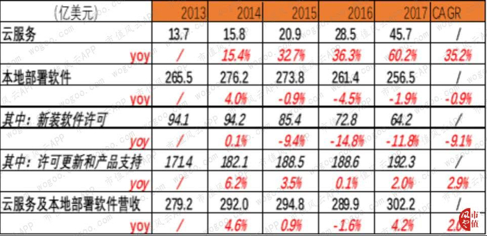 虽然,新装软件许可的营收占比不高。2017财年,本地部署软件257亿美元的营收中,来自“新装软件许可”的营收仅为64亿美元,占比25%。