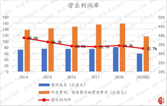 由于期间费用率的上升,近年来营业利润率有所下降。从2014财年的39%降至2018财年的34%,以及2019财年前三季度的33%。