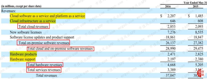 2016财年,公司如今的“云服务及许可”业务在当时还叫“云及本地部署软件(Cloud and on-premise software)”业务。