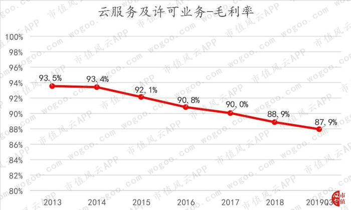 鉴于本地部署软件过去几年的毛利率一直稳定,且高达96%,我们可以推测出,近年来该业务毛利率的下降,一部分原因是云服务占该业务营收的比重不断提高。