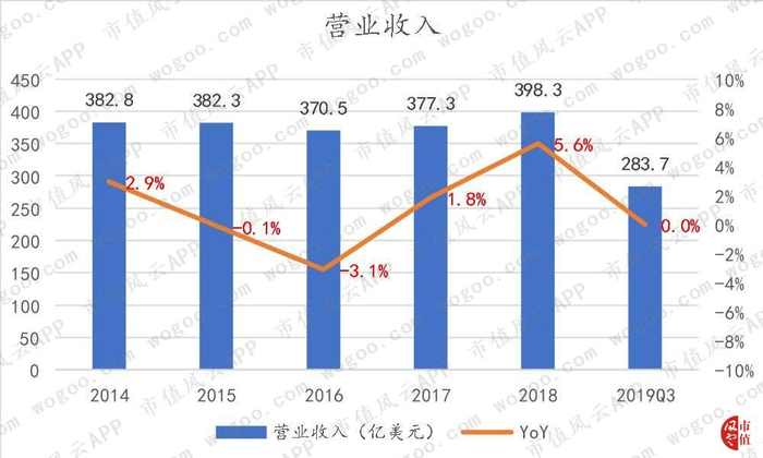 2018财年,公司实现营收398亿美元,同比增长5.6%,是近年来的最高增速。然而2019财年前三季度,公司实现营收283亿美元,出现了零增长。