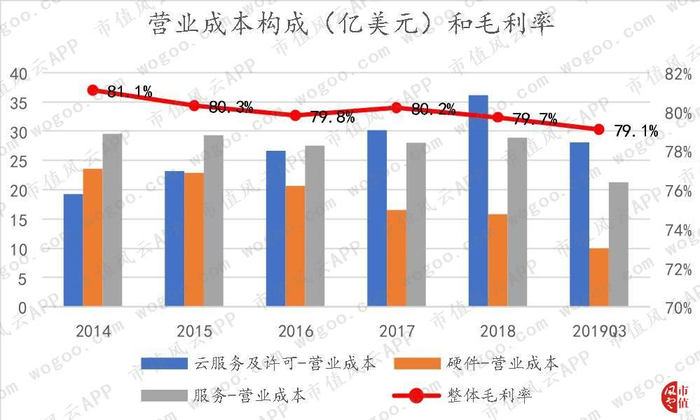 整体毛利率略有下降。从2014财年的81%下降至2018财年的80%,以及2019财年前三季度的79%。