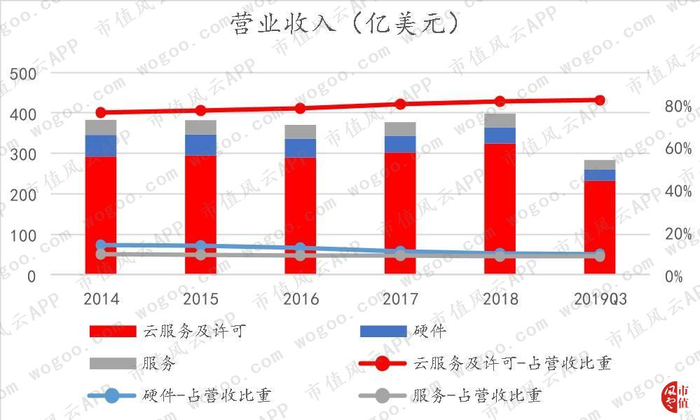 2018财年及2019财年前三季度,云服务及许可业务分别实现营收324亿美元和232亿美元,占当期总营收的81.5%和81.9%;
