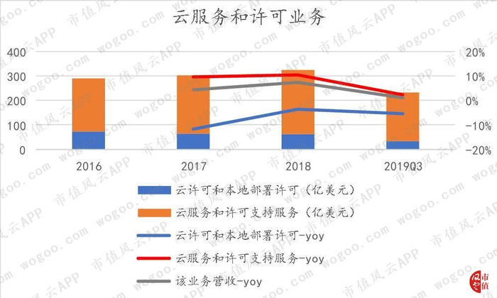 公司只披露了追溯到2016财年的相关分类收入。2018财年和2019财年前三季度,云服务和许可业务分别实现营收324亿美元和232亿美元,同比增长7.4%和1.1%。