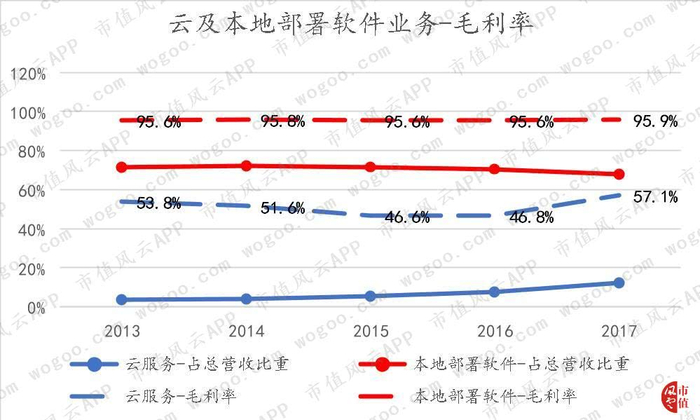 虽然目前已经无法得知云服务以及本地部署软件各自的增长情况,但从近年来毛利率的变化情况看,仍可以推测出,这项业务的增长主要来自于云服务的推动。