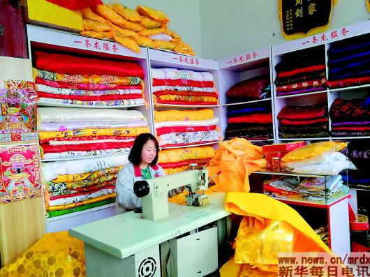 3月19日,刘绵海的寿衣店内,一名员工正在加工寿被。记者黄海波 摄