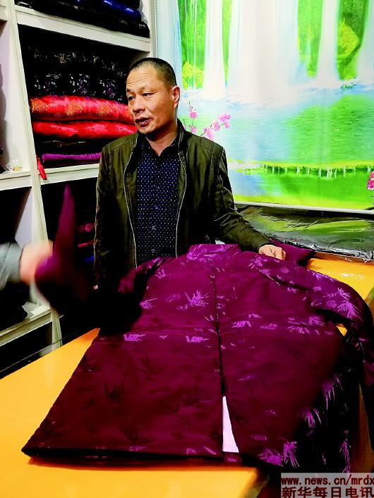 3月19日,刘绵海展示一款寿衣。记者黄海波 摄