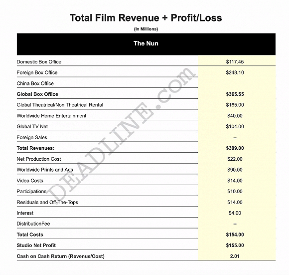 据统计,《鬼修女》的制作成本约为2200万美元(不计宣发),上映首周北美票房为5380万美元,海外票房更是高达1.331亿美元,成为“招魂”系列首周末票房最高的电影,并最终以3.656亿美元的全球总票房创下系列最佳。自电影《小丑回魂》(改编自斯蒂芬·金1986年的同名小说,北美首映票房高达1.234亿美元)大获成功以来,华纳兄弟便将劳动节档期视为赚钱的又一良机,并计划于今年9月推出《小丑回魂》的续集作品《小丑回魂2》。除了《鬼修女》之外,另一部“招魂”宇宙电影《安娜贝尔2:诞生》也曾于2018年登上过我们的榜单,影片成本约为1500万美元,全球票房却高达3亿美元。