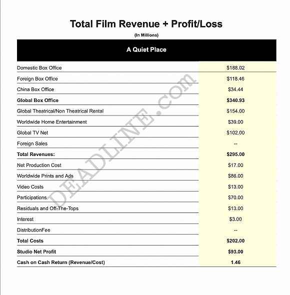 《摘金奇缘》成本与收入数据统计表作品:《寂静之地》