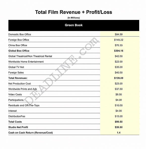 在种族隔离严重的美国南部地区,“绿皮书”是一份特殊时期诞生的特殊读物,上面列着当地黑人可以吃饭睡觉的地方,是一份不折不扣的黑人司机行路指南。影片发行初期表现并不理想,上映10天仅获得780万美元的票房,尽管如此,《绿皮书》仍然在颁奖季中表现出色,一共收获5项奥斯卡提名,并最终获得包括最佳影片、最佳男配(马赫沙拉·阿里)以及最佳原创剧本在内的3项大奖。在这个分裂的时代,影片“求同存异,尊重他人”的主题值得我们每一个人深思。《绿皮书》在北美地区的发行由环球影业负责,该片获奖后票房一路攀升,增幅达到了自2011年奥斯卡最佳影片《国王的演讲》以来的最高点。截至目前,影片美国国内票房为8460万美元,全球票房为3.042亿美元(中国为其贡献了高达7030万美元的票房)。据估计,环球影业将获得约1500万美元的发行费,而安培林和狮门影业将获得高达4000万美元的海外发行费。