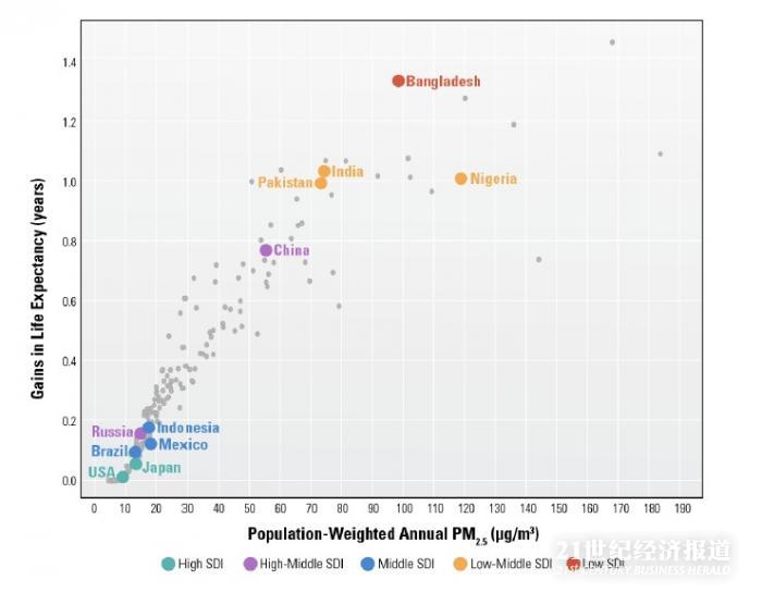 对于那些空气污染严重,而社会人口学指数(SDI)低的国家,消除空气污染对人均预期寿命提升的贡献更大。