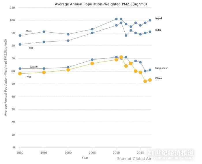 这近500万人中,将近一半在中国和印度。包括印度在内,孟加拉国、尼泊尔、巴基斯坦等南亚国家是世界上污染最严重的地区。相比之下,中国在近五年间实现了空气质量初步但显著的改善。