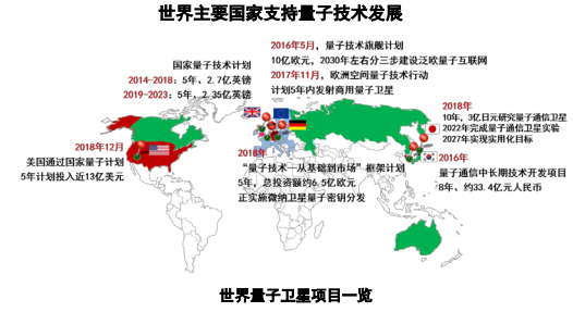 同时在全球范围内,世界主要国家均高度关注量子信息技术发展,甚至上升为国家战略,特别是2016 年以来,各国支持政策密集出台。欧盟量子技术旗舰计划,计划 2035 年左右形成泛欧量子安全互联网;英国希望在 10 年内建成国家量子通信网络;德国提出“量子技术——从基础到市场”框架计划,希望推动实现量子技术的产业化发展;美国正式通过国家量子计划法案。日本、韩国、俄罗斯、加拿大等国也启动了各自的量子通信发展计划,一系列量子通信卫星研发等众多项目纷纷出台并付诸实施。
