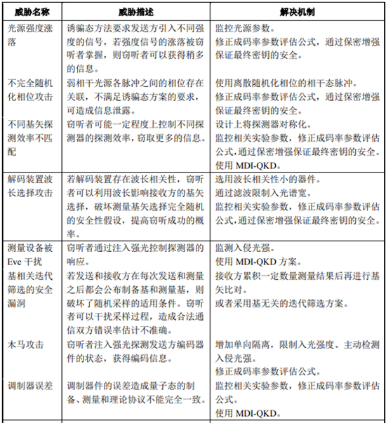 此外,对于实际条件下QKD系统面临的安全威胁,在学术界亦已经有比较充分的研究,对于已发现的安全威胁全部都具有相应的有效易行的防御措施。具体见下表。