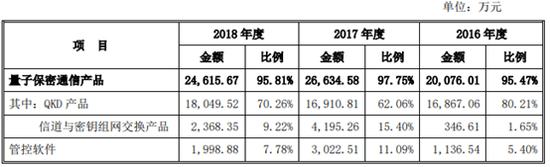公司主要产品为量子保密通信产品,2016-2018年销售占比均占到95%以上。其中QKD产品在三年中分别占据80.21%、62.06%、70.26%,其次为信道与密钥组网交换产品,2018年度占销售总量的9.22%。公司的QKD产品主要包括城域QKD产品和骨干网QKD产品两类。骨干网实现跨省、跨城的连接(包括地面光纤和卫星-地面站两种实现方式),城域网实现城市内不同区域、不同行业机构的连接。