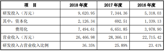 在2016年到2018期间,公司研发投入总额分别为5318万元、7344万元和9621万元,而公司同期净利润为5875万元、7431万元、7189万元。研发投入占营业收入的比例达到23.41%、25.89%和36.35%,且显现出不断加码的态势。最近三年累计研发投入占最近三年累计营业收入的比例高达28.73%。