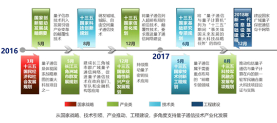 在对信息安全高度重视的背景下,2015 年我国关于“十三五”规划建议的说明中明确指出,要在量子通信等领域部署体现国家战略意图的重大科技项目。2016年7月量子通信更是被列入了我国“十三五”国家科技创新专项规划。此后我国出台了十余项国家政策均明确要求推进量子通信发展。