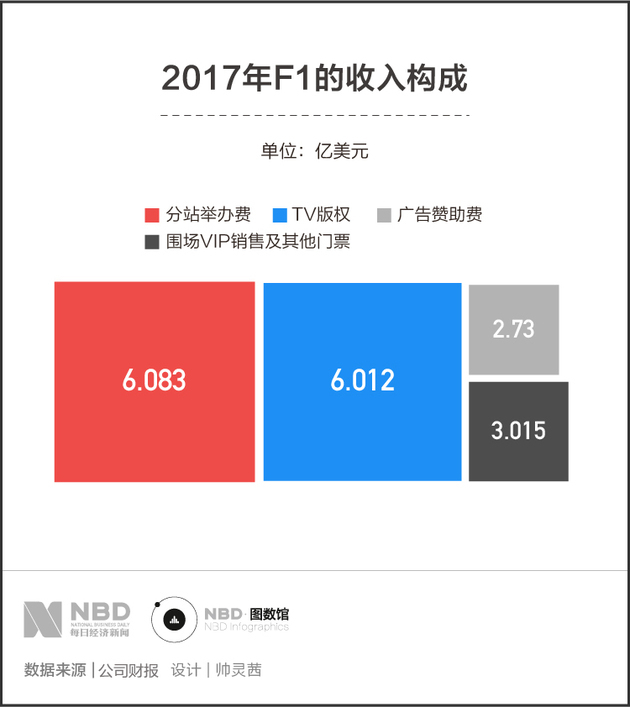 F1目前的收入由四部分构成。以2017年世界一级方程式18亿美元的收益为例,排名第一的是由各分站举办方交纳的举办费:6.083亿,然后是电视版权费6.012亿。