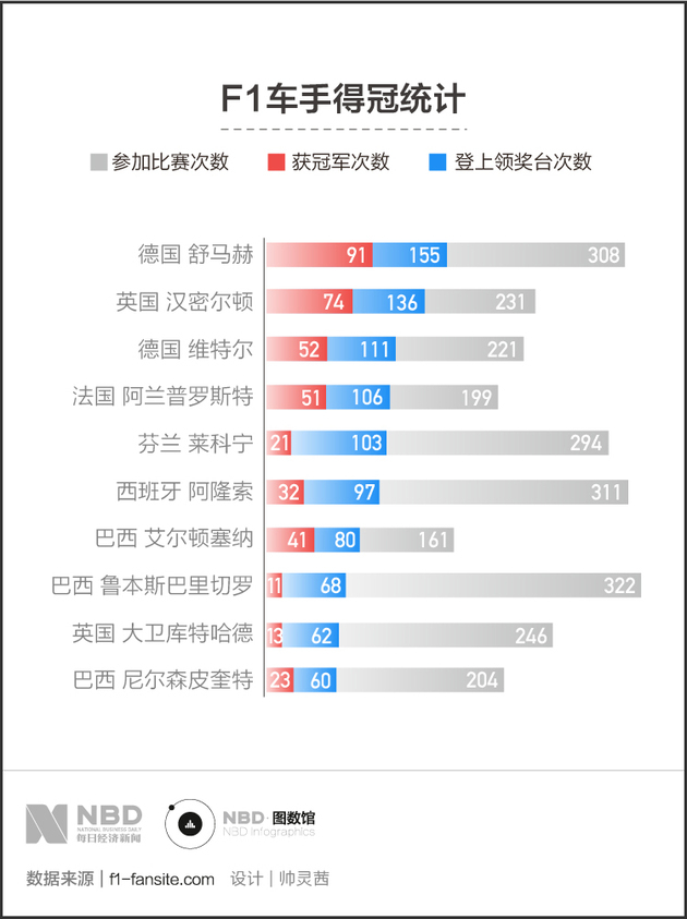 999场大奖赛的冠军,被来自23个国家的105名车手瓜分,但只有33个人拿到过10次以上的冠军,此外还有31位车手只拿过一次冠军。