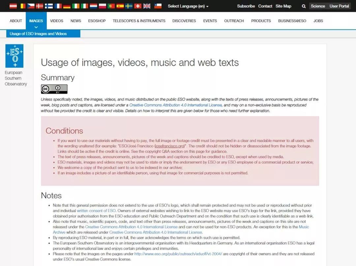 除非特别标注,在 ESO 公共网站上分发的图像、视频、音乐,以及新闻稿文本、公告、每周图片、博客文章和字幕,均通过“知识共享-署名”(CC-BY)4.0 国际版协议授权,只要清晰可见地标注了来源,即可非独占、免费地使用。