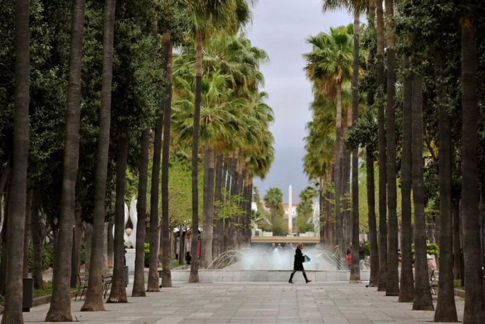 4月4日,行人走过西班牙阿尔梅里亚一条街道上的喷泉。新华社记者郭求达摄