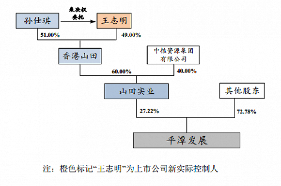 变动之后,王志明拥有对香港山田100%股份表决权,实际控制香港山田;而香港山田持有上市公司控股股东山田实业60%股份,为山田实业控股股东;山田实业持有平潭发展27.22%股份,为上市公司控股股东。通过上述股权控制关系,王志明单一控制上市公司27.22%的表决权,成为上市公司实际控制人。